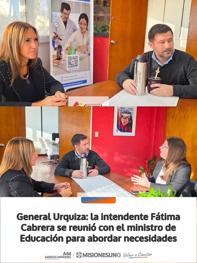 La intendente de General Urquiza, Fátima Cabrera, mantuvo una reunión con el ministro de Educación de la provincia, Ramiro Aranda, en la que participaron además autoridades educativas locales, entre ellas la directora de la Escuela N.º 221 de Colonia Gisela, Paulina Soleda González.