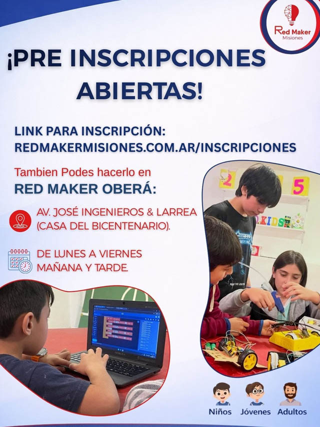 Desde Red Maker Oberá informaron que ya se encuentran abiertas las preinscripciones para participar de las propuestas formativas correspondientes al ciclo 2026, destinadas a personas de distintas edades que deseen incorporar conocimientos en el ámbito tecnológico.