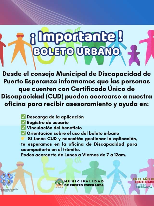 AGENCIA MISIONES.UNO | El Consejo Municipal de Discapacidad de Puerto Esperanza informó que las personas que cuenten con Certificado Único de Discapacidad (CUD) pueden acercarse a la oficina para recibir asesoramiento y acompañamiento en la gestión del Boleto Urbano.